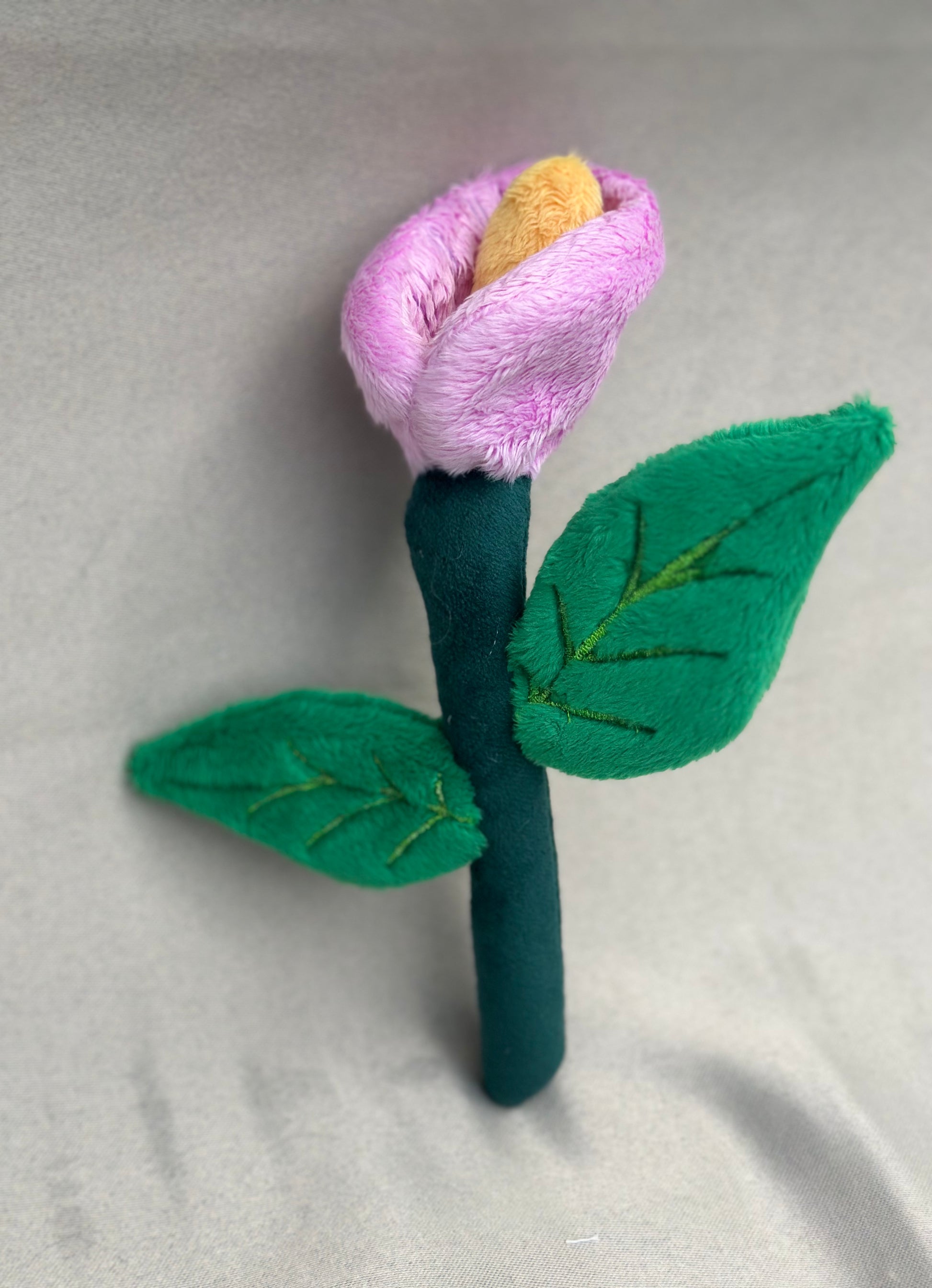 Made of Minky with embroidered details and a stem that is lightly wired to hold strength. Can even be scented if desired!