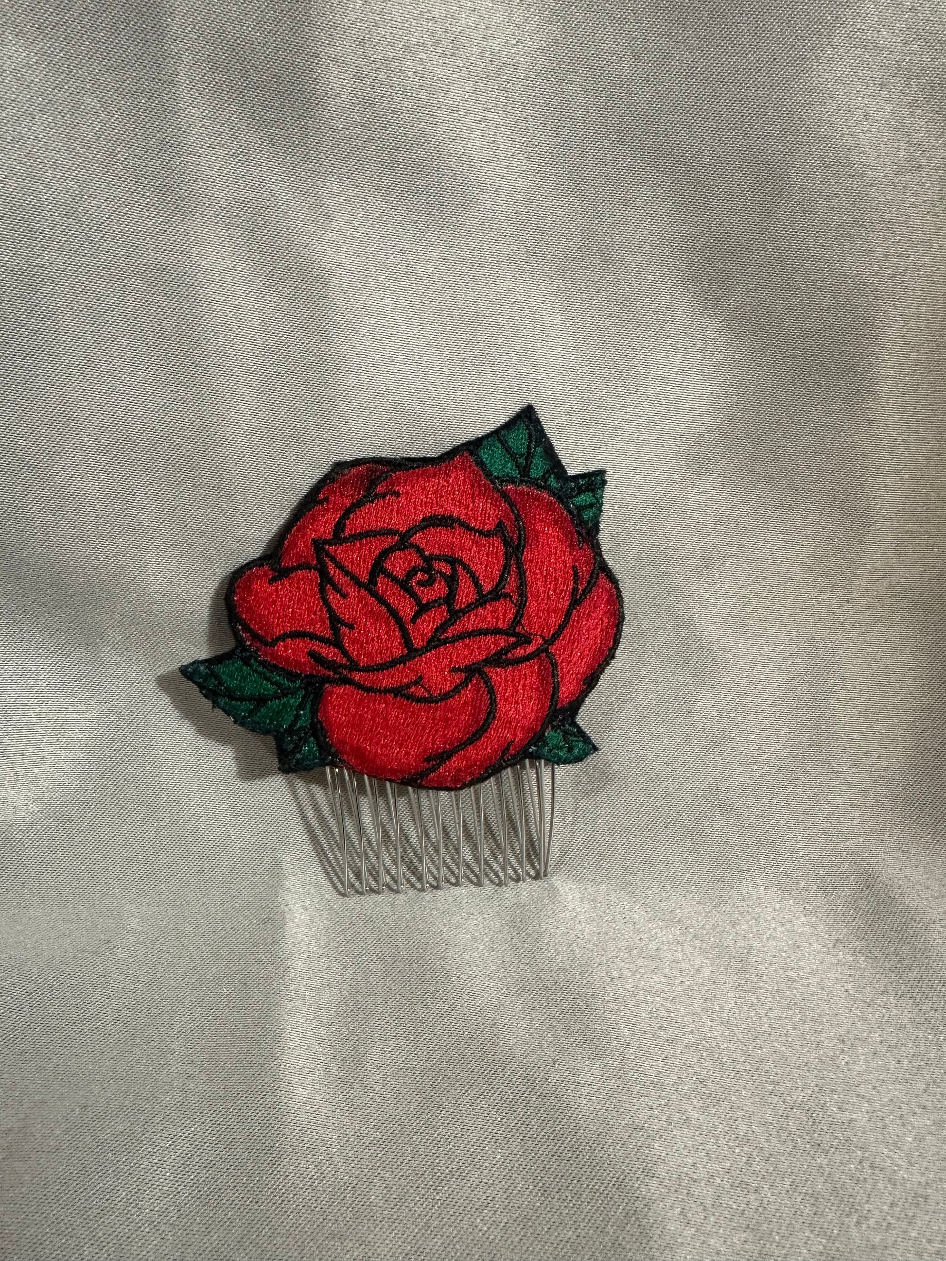 Embroidered & backed onto stiffened felt to ensure durability then mounted to either an alligator clip, hair comb or hair clip.