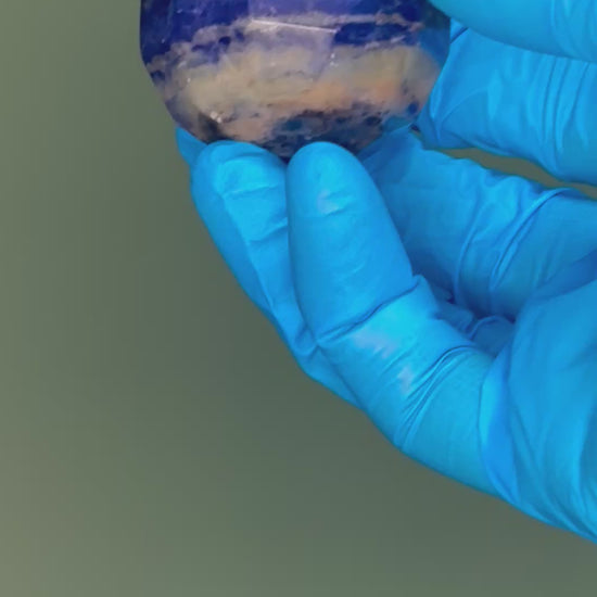 Named for its sodium content, Sodalite is a chloric sodium aluminum silicate with a harness of 5.5 to 6. It is classified as a feldspathoid and is well-known for its rich blue color intermingled with white Calcite, though it may also form as gray, yellow, green, or pink.