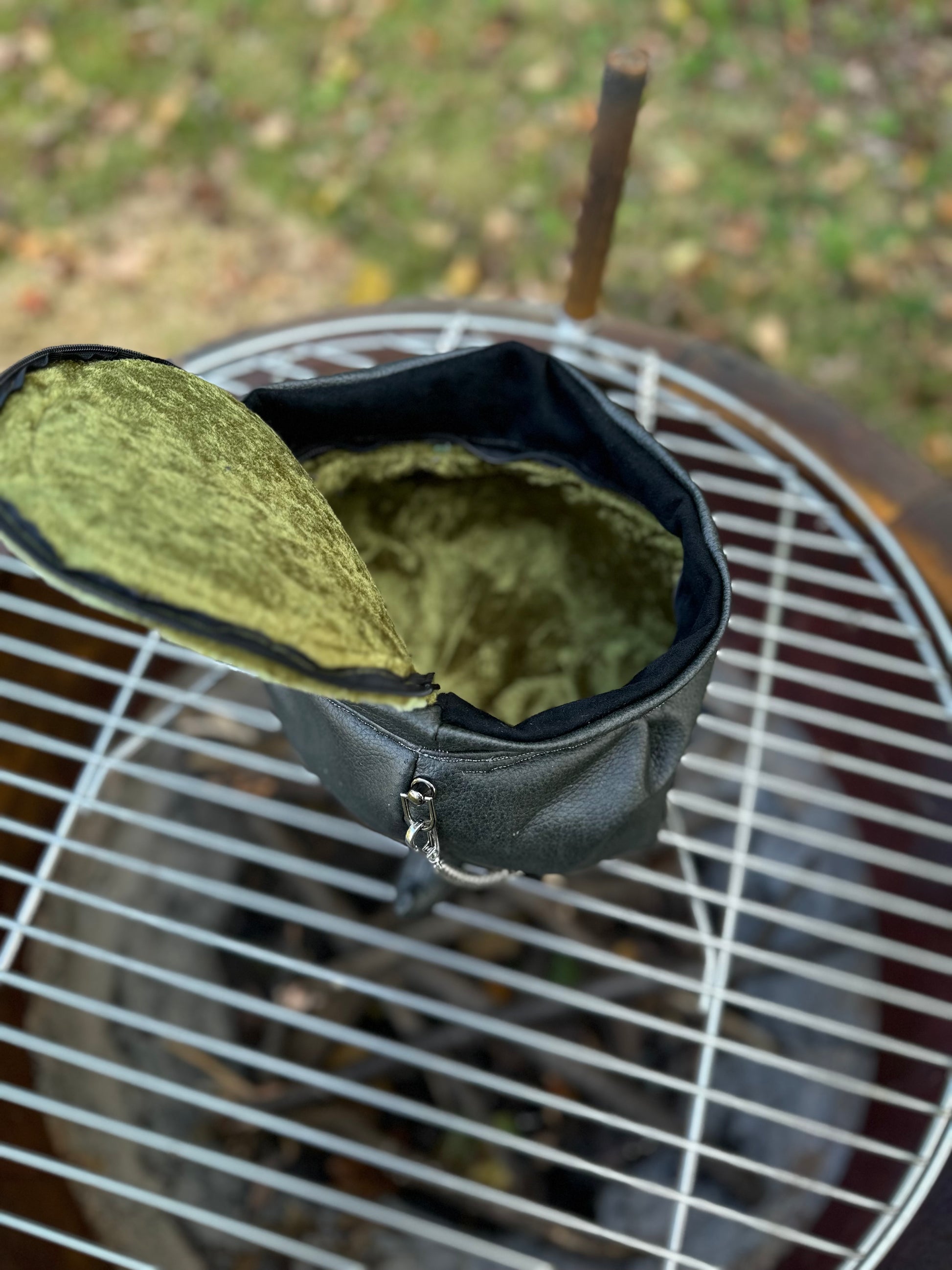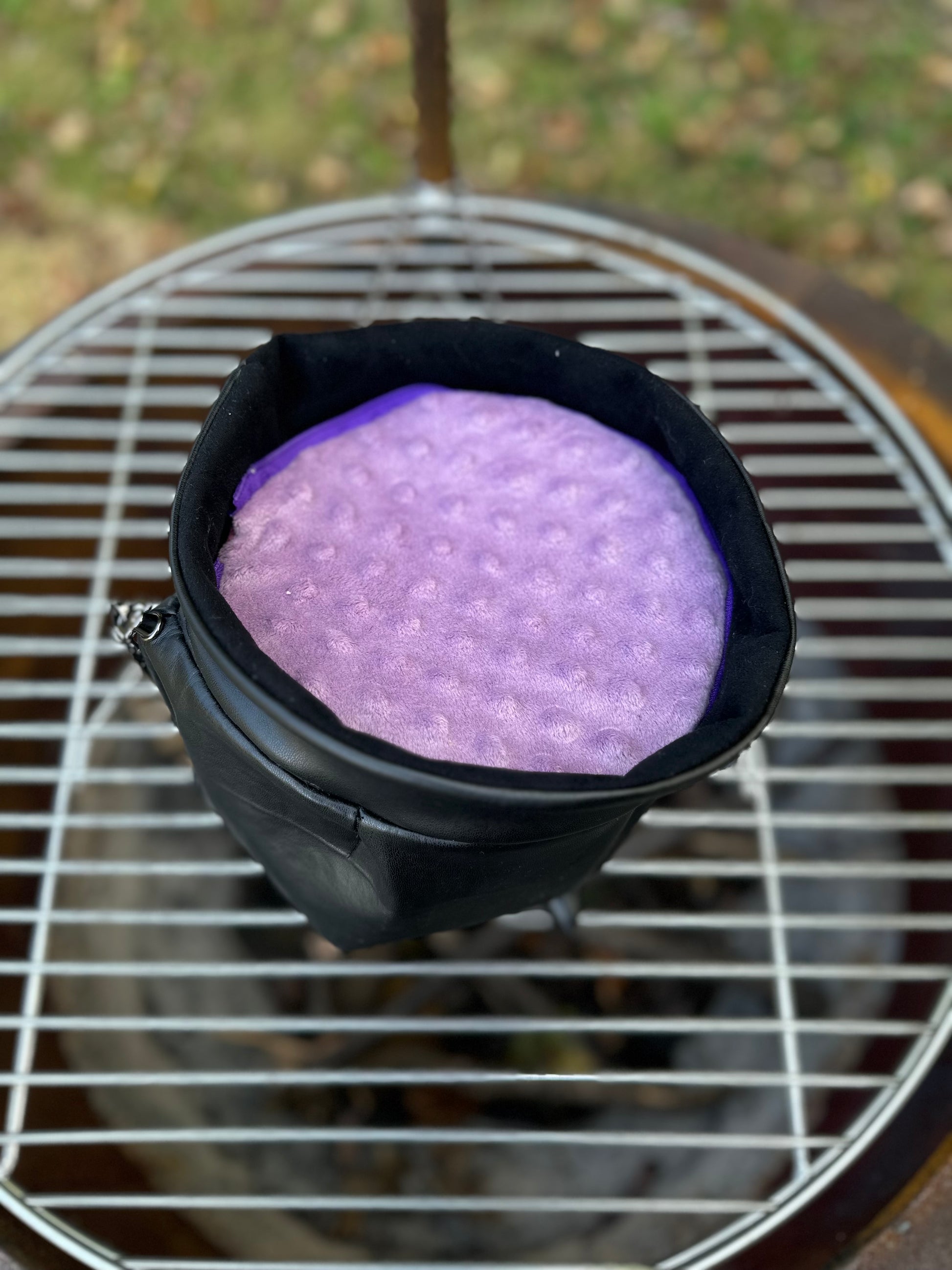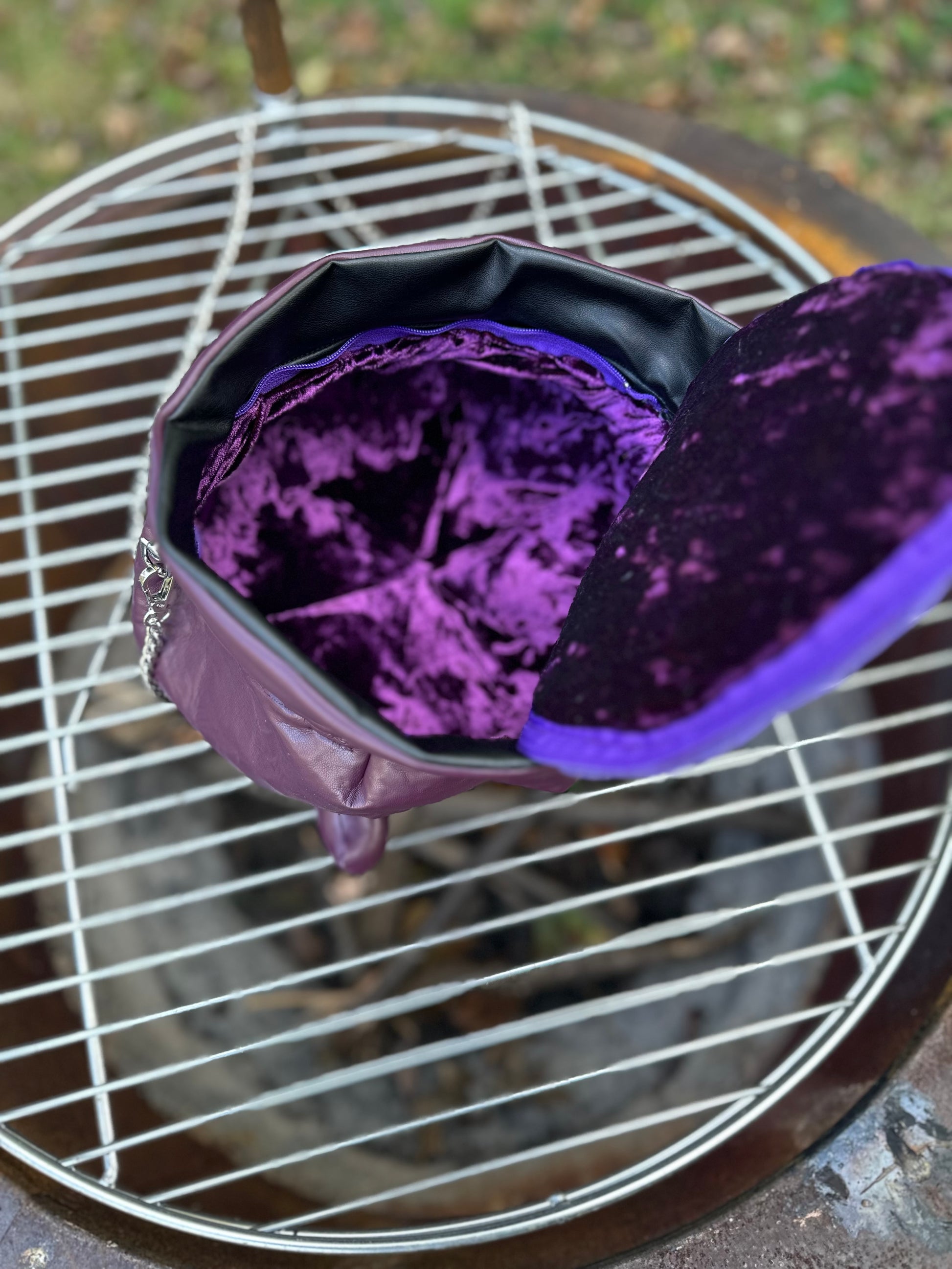 Made of Faux Leather lined with velvet. The bubbling lid is padded & has a Bubble Minky lid. Just like a cauldron, the strap is made of fashion chain purse hardware. Lid zips all the way around for easy access. Chain strap can be clipped on or off.