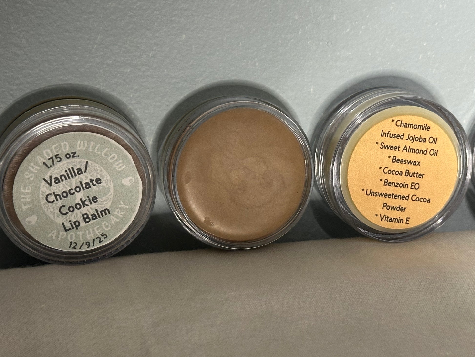 Smells wonderful but not to be eaten. This all natural lip balm may smell like a vanilla/chocolate cookie but don't eat it!
